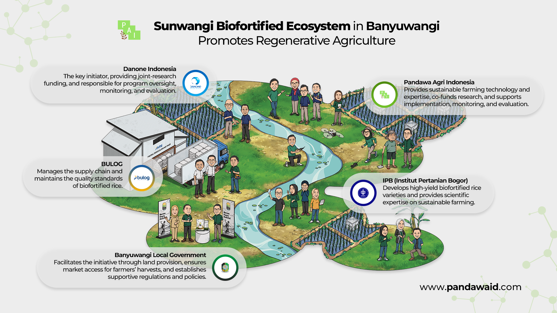 This mission to expand regenerative farming practices in Banyuwangi is carried out through collaboration among multiple stakeholders: the Banyuwangi Regency Government, IPB University, BULOG, Danone Indonesia, and Pandawa Agri Indonesia. Together, they are building the Sunwangi biofortified rice value chain, rice with up to three times higher nutrient content than conventional rice, produced regeneratively and consumed by local communities.
